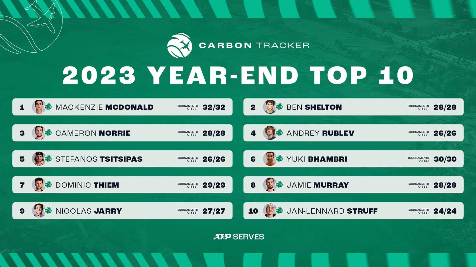 Los 3 jugadores mejor clasificados al final del año se repartirán una bolsa de premios de 100.000$, donada a iniciativas de sostenibilidad medioambiental de su elección. Todos los jugadores que tengan una compensación del 100% de sus viajes en la temporada recibirán una Insignia Verde Carbon Tracker, reflejada en su perfil ATPTour.com.